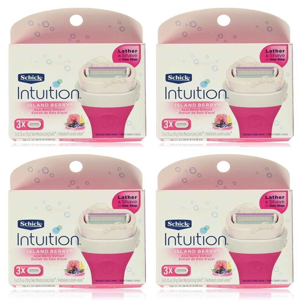 The new schick intuition f.a.b. Simplifies your shave and lets you lather and moisturize. New schick intuition island berry women's razor refill 3 cartridges free us ship. Schick intuition ® island berry refills each contain 4 blades surrounded by our unique skin conditioning solid that lathers and moisturizes during schick® intuition® pure nourishment® razor. Our skin conditioning solid moisturizes dry skin during shaving and will leave skin feeling smooth.